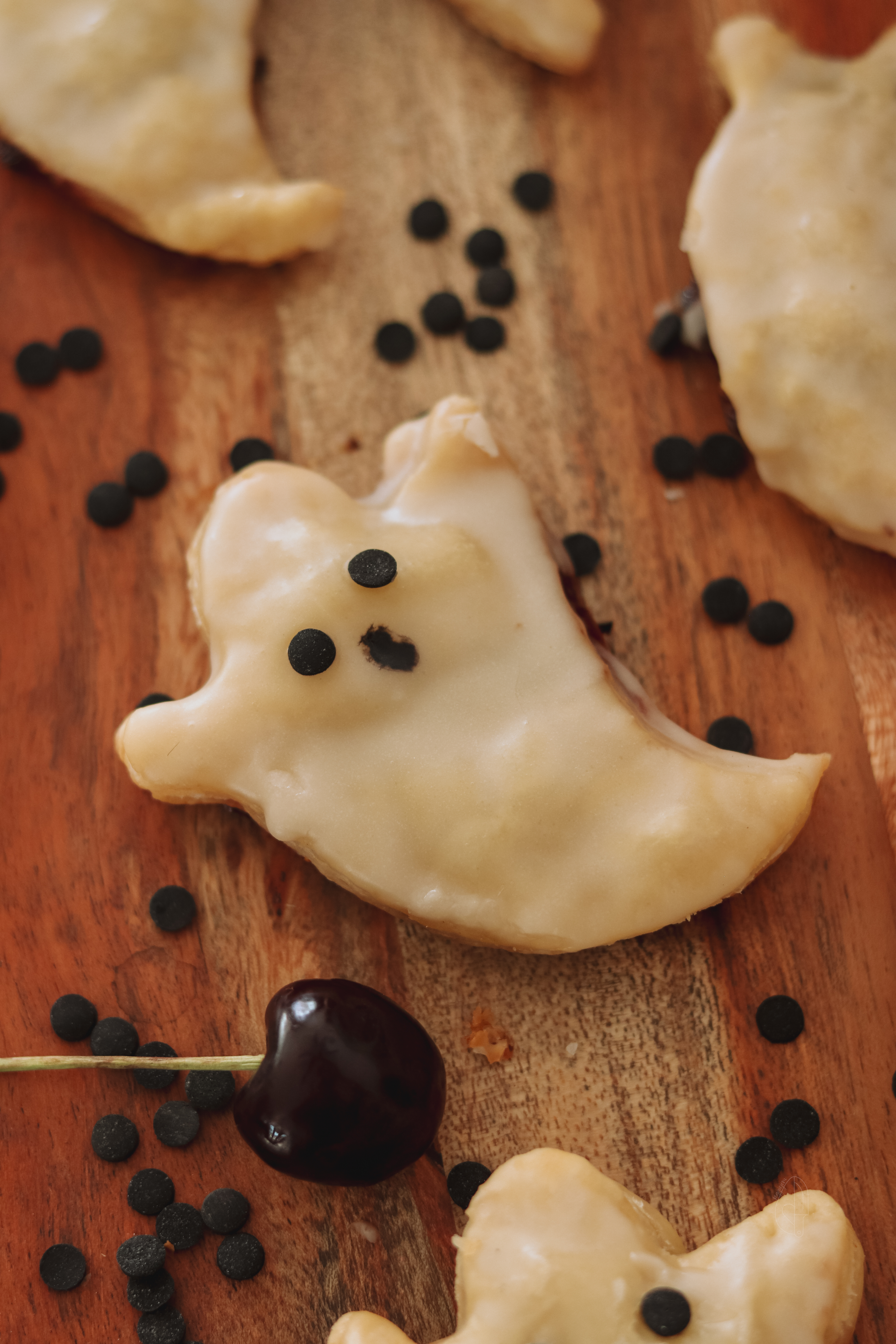 Flaky vegan puff pastry filled with cherry jam and chocolate hazelnut spread, glazed into spooky-cute ghost pop-tarts.